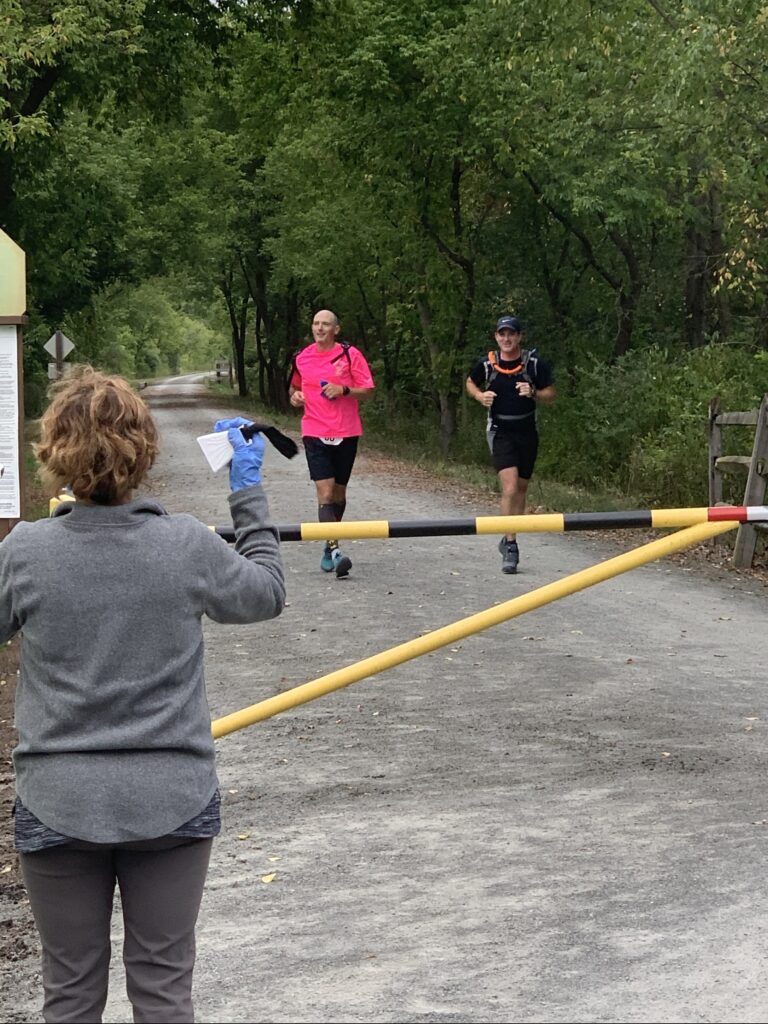 The race was entirely on the Pennsylvania Grand Canyon Trail, which was flat. The surface was gravel and it was not closed to traffic. We saw many cyclists out there and they were great cheerleaders. There was a TON of dust, so the buffs actually came in quite handy. Each aid station took down the bib number as they came in so the race had eyes on where people were. There was only one portion that was not accessible and that was a stretch through the canyon. There was the option to camp right at the start line. The race also had a marathon, 50k, 50 miler, and 100 miler.