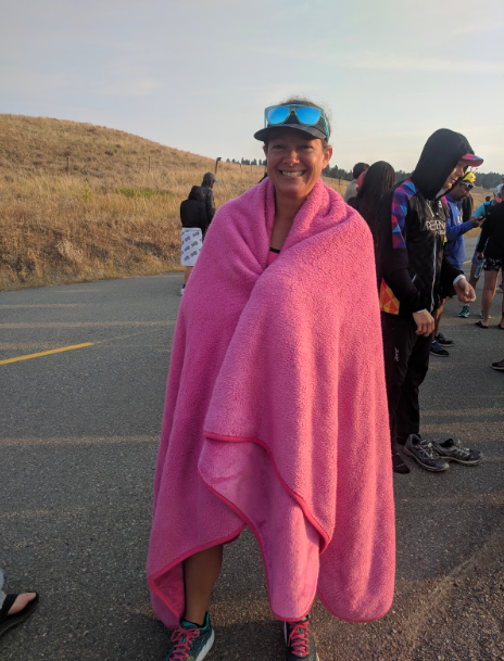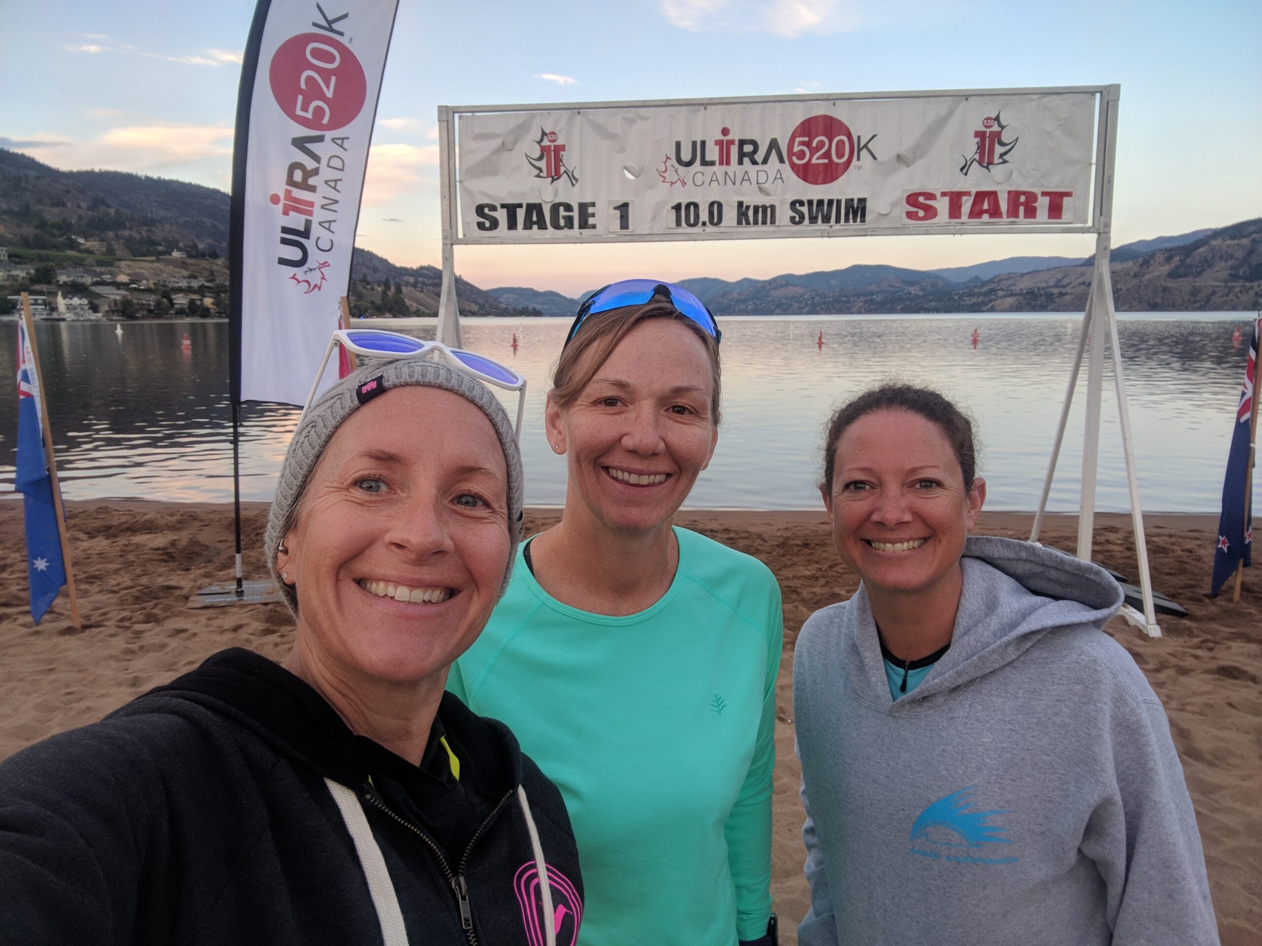 4 AM wake up to eat breakfast and get ready. We headed down to the beach for the swim start. Steve, the race director, spoke briefly and we had a dedication from a local member of the First Nations. The athletes stood in a circle on the beach surrounded by a bigger circle of the crews. The Canadian national anthem was sung and it was time to start. Jenny was in the kayak as support for Liz to guide down the lake and carry her nutrition.