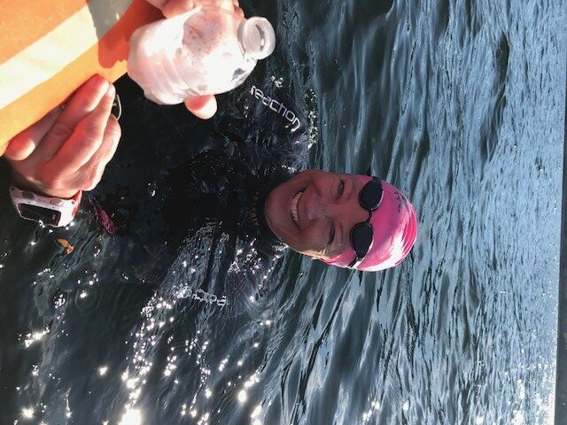 We both set our watches for every 45 mins to alert us it was time for her to take in some nutrition. I would also call Jen every break to let her know how far out we were so she would know when to expect us. We did great, I would take one stroke with my paddle probably every 3 strokes Liz would take. She had a hard time seeing me as I stayed on her left side which meant the sun was directly in her eyes. She would fall behind or I would get ahead and I would try to adjust as quickly as possible to get us back on course. It started getting windy but it was a tailwind so it was actually helpful and not too rough. At one of our stops for nutrition we were both in tears celebrating how far she had gone and that we were over half way there. I knew the 8k buoy was close to a tree line down to the water and I knew we were getting closer. I had binoculars and was so happy to finally see the buoy in sight! The closer we got to the point the water got super choppy. At one point I could’ve easily gone over and Liz took in a good bit of water.