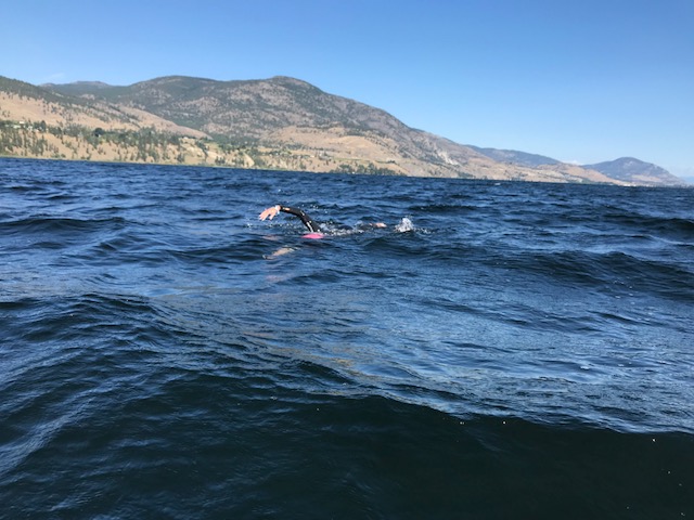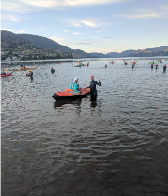 The day before the race we got to do a practice in Skaha Lake, the water was like glass, so nice & clear. Liz had a little panic moment when we first started because of all the grass she could see close to shore but once we got through that she was fine. We were both glad to get that panic moment out of the way before race day. The morning of the swim I was super nervous, I didn’t sleep most of the night. It’s a lot of pressure knowing you can make or break someone’s day by screwing up when they’re dependent on you. We got to the lake early so I could get the kayak ready. I taped Liz’s 8oz bottles to the inside of the kayak by my legs so they would be easily accessible. We got started about 5 secs after the initial start to let the faster swimmers get ahead of us. Liz had no panic moments as we got started as she did the day before!