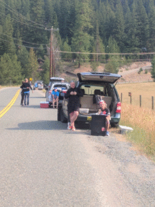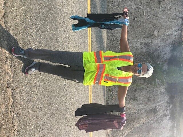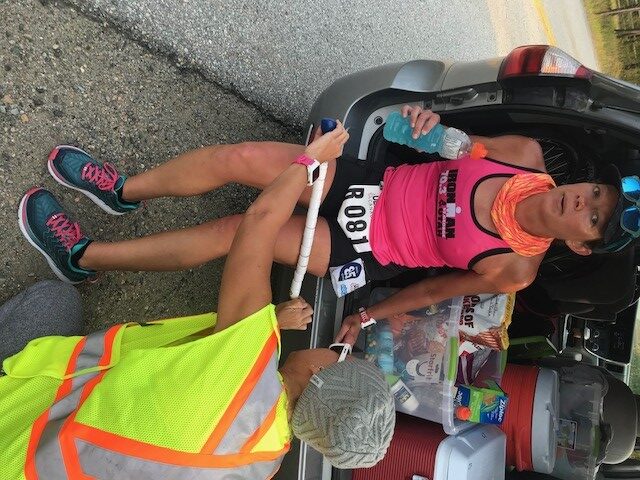 There is a lot of guesswork, trial and error and math involved. Calculate how fast they are going, how much time you have, and try and anticipate their needs. They can shout to you what they want, or say “next stop I want xyz” so you have it ready. We definitely had a few kinks to work out the first day. One of the race officials on a motorcycle, who we got to know real well that day, told us at the top of the first pass that we had let too much space between us and her. If she got into trouble we wouldn’t be there. And in fact it was at the top of that first pass that I think the “healthy appreciation” began for our athlete. She had blown up her heart rate and was not feeling good. She got off her bike and sat on the back of the van for quite a while to get her heart rate to recover so she could carry on.