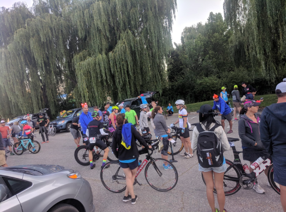 When they got started I had about 4 hours to get to swim exit, and get transition set up. I was talking to one of the other crew members (Hi Brian!!) and we went and grabbed a coffee at Tim Hortons and had a nice chat. Then I went to buy ice (one of the tips we got was to buy more ice than you think you will need). First gas station, no ice. Second gas station, no ice. Third store, closed. Finally went to Walmart and they had ice. I loaded up and drove to the exit. The transition area was tiny and kind of in a residential area. I had to park super far away and then make multiple trips to bring down her bike, gear, and nutrition.