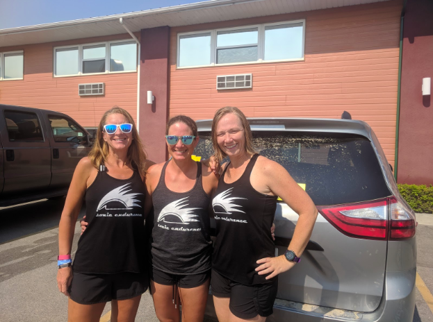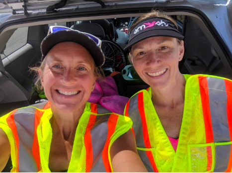 The day started off fun with Jen in the party van. After the first half marathon we knew Liz was going in a dark place so we agreed it was time for Jen to start running with her. As the miles went on athletes were more strung out in distance which meant I was only leapfrogging with a few athletes and crews. Every time I saw someone I would encourage them but at some point what else do you say? I’m sure they got tired of me saying “go____, or great job” I would’ve. I always made sure athletes were ok and would ask if they needed anything. I made stops every .50- .75 to check to see if Liz or Jen needed anything. I would meet them out away from the car then run back to get whatever Liz needed in an effort to keep her from stopping. I recorded my distance from the odometer at each stop to remember at what distance I stopped because as they day gets longer you can’t math or remember anything other than you know your athlete is in front or behind you. I sang “She’ll be coming around the mountain when she comes” a lot to myself. I was hoping at some point to be asked to run with Liz to give Jen a break and to break up the monotony of crewing from the car all day but I wasn’t which made for a very long day with one playlist on my phone. While we had plenty of stuff for Liz in the car as far as snacks go we neglected to get anything for ourselves. I did have a slice of leftover pizza from dinner the night before, cold pizza tastes good when you have nothing in the middle of nowhere but I never want to see another ketchup chip or jalapeño cheddar popcorn ever again. I was disappointed when there was nobody at the first cutoff at 26.2 miles, I was hoping to see someone but nope. As the miles went on and closer to finish we got I started to get notifications on my Garmin which meant I had cell service!! I was thrilled and decided to make a couple of videos to let the world know how Liz was doing as I knew everyone was dying to hear from us since we were out of touch for so long. I was jumping up and down when I finally saw the sign to call the finish line to let them know Liz was coming in. I thought the finish was closer as I headed in but had to stop once again because it was longer than I thought. I drove in and met Liz and Jen at the finish to run in together, we were all so glad to be done!!!  (I will add here that Jenny made at least 67 stops through the day, we don’t know the exact number)